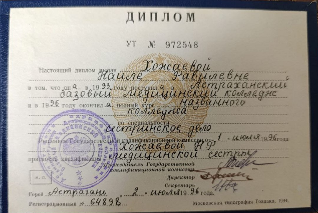 - 1996 - Астраханский базовый медицинский колледж, специальность «Сестринское дело».