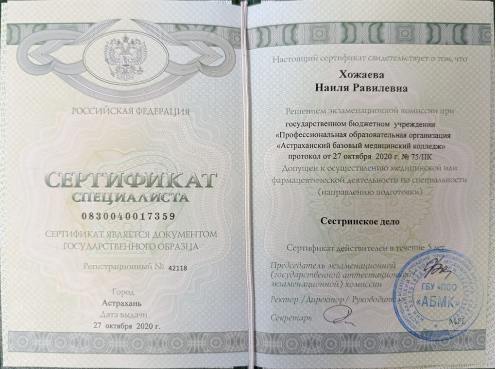 - 2020 - Сертификат специалиста по специальности «Сестринское дело», Астраханский базовый медицинский колледж.